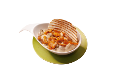 Cabrillas en salsa de Kebab, acompañada de carne de pollo, autentico Kebab, y una tortita, y una tortita para mojar.