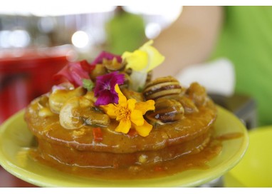 Cabrillas en salsa con rabo de toro y chorizo de nuestra tierra, adornadas con flores comestibles.